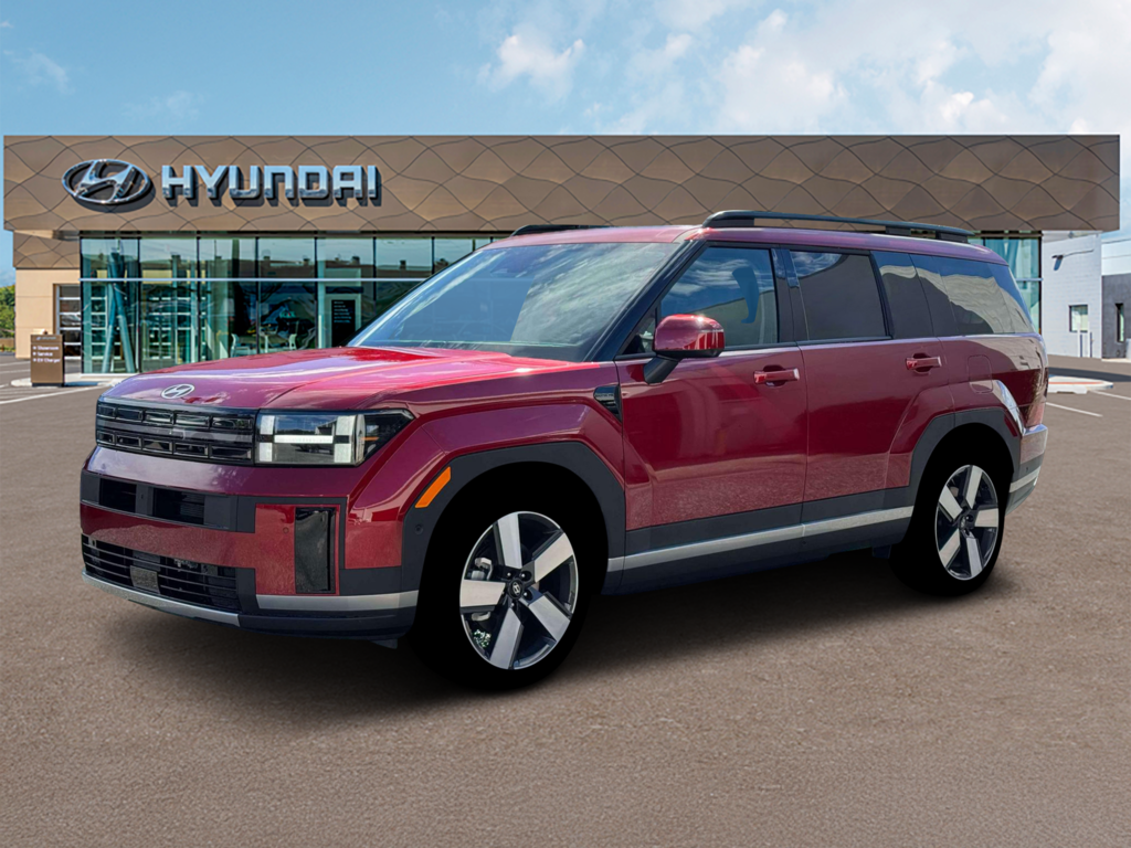 Ultimate Red 2026 Hyundai Santa Fe Hybrid Limited AWD 6-Speed Automatic with Shiftronic I4 12 Speakers, 3rd row seats: bench, 4-Wheel Disc Brakes, 7-Passenger Bench Seating, ABS brakes, Air Conditioning, All Season Fitted Liners, Alloy wheels, AM/FM radio: SiriusXM, Apple CarPlay & Android Auto, Auto High-beam Headlights, Auto-dimming Rear-View mirror, Automatic temperature control, Brake assist, Bumpers: body-color, Cargo Net, Cargo Organizer, Carpeted Floor Mats, Delay-off headlights, Driver door bin, Driver vanity mirror, Dual front impact airbags, Dual front side impact airbags, Electronic Stability Control, Emergency communication system, Exterior Parking Camera Rear, First Aid Kit, Four wheel independent suspension, Front anti-roll bar, Front Bucket Seats, Front Center Armrest, Front dual zone A/C, Front reading lights, Fully automatic headlights, Garage door transmitter: HomeLink, Heated and Ventilated Front Bucket Seats, Heated door mirrors, Heated front seats, Heated rear seats, Heated steering wheel, Illuminated entry, Knee airbag, Leather Seat Trim, Leather steering wheel, Low tire pressure warning, Memory seat, Navigation System, Occupant sensing airbag, Option Group 02, Outside temperature display, Overhead airbag, Overhead console, Panic alarm, Passenger door bin, Passenger vanity mirror, Power door mirrors, Power driver seat, Power Liftgate, Power moonroof, Power passenger seat, Power steering, Power windows, Radio: AM/FM/HD Bose Premium Audio System, Rain sensing wipers, Rear anti-roll bar, Rear side impact airbag, Rear window defroster, Rear window wiper, Remote keyless entry, Security system, Speed control, Speed-sensing steering, Split folding rear seat, Spoiler, Steering wheel mounted audio controls, Tachometer, Telescoping steering wheel, Tilt steering wheel, Traction control, Trip computer, Turn signal indicator mirrors, Variably intermittent wipers, Ventilated front seats, Wheels: 20" x 8.5J Alloy.