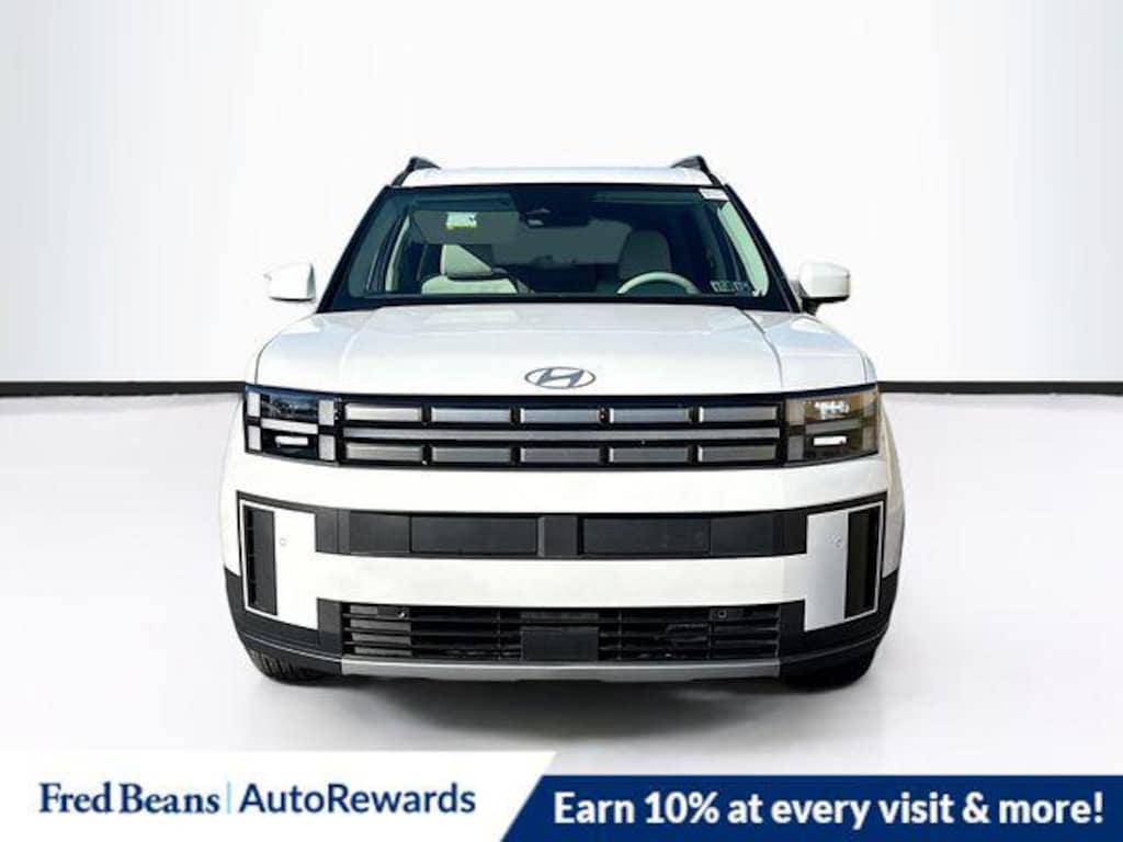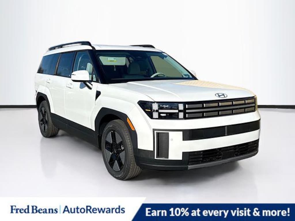 Serenity White 2026 Hyundai Santa Fe Hybrid SEL AWD 6-Speed Automatic with Shiftronic I4 I4, 18" x 7.5J Alloy Wheels, 3rd row seats: bench, 4-Wheel Disc Brakes, 6 Speakers, ABS brakes, Air Conditioning, Alloy wheels, AM/FM radio: SiriusXM, Apple CarPlay & Android Auto, Auto High-beam Headlights, Automatic temperature control, Brake assist, Bumpers: body-color, Cargo Blocks, Cargo Cover/Screen, Cargo Net, Cargo Tray, Carpeted Floor Mats, Delay-off headlights, Driver door bin, Driver vanity mirror, Dual front impact airbags, Dual front side impact airbags, Electronic Stability Control, Emergency communication system, Exterior Parking Camera Rear, First Aid Kit, Four wheel independent suspension, Front anti-roll bar, Front Bucket Seats, Front Center Armrest, Front dual zone A/C, Front reading lights, Fully automatic headlights, H-Tex Leatherette Seat Trim, Heated door mirrors, Heated Front Bucket Seats, Heated front seats, Illuminated entry, Knee airbag, Leather steering wheel, Low tire pressure warning, Mudguards, Occupant sensing airbag, Option Group 01, Outside temperature display, Overhead airbag, Overhead console, Panic alarm, Passenger door bin, Passenger vanity mirror, Power door mirrors, Power driver seat, Power Liftgate, Power steering, Power windows, Radio: AM/FM/HD Display Audio, Rear anti-roll bar, Rear seat center armrest, Rear side impact airbag, Rear window defroster, Rear window wiper, Remote keyless entry, Roadside Assistance Kit, Security system, Speed control, Speed-sensing steering, Split folding rear seat, Spoiler, Steering wheel mounted audio controls, Tachometer, Telescoping steering wheel, Tilt steering wheel, Traction control, Trip computer, Turn signal indicator mirrors, Variably intermittent wipers, I4. Price includes: $4250 - Hyundai HMF Dealer Choice : $4250 discount and 5.49% APR for 24 months. $44.09 per $1000 financed. Available to well qualified buyers who finance through Hyundai Motor Finance. H704. Exp. 12/01/2025