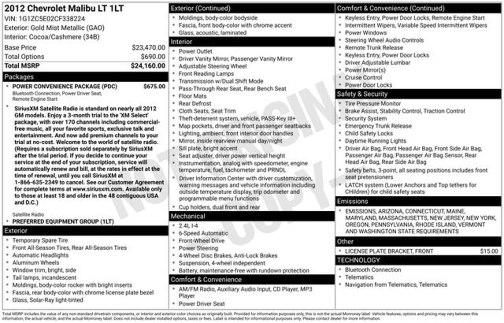 2012 Chevrolet Malibu LT 1LT ECOTEC 2.4L I4 MPI DOHC VVT 16V 6-Speed Automatic Electronic with Overdrive FWD 4D Sedan Gold Mist Metallic