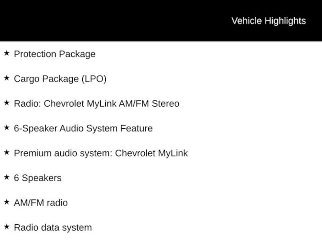 2-Way Manual Front Passenger Seat Adjuster, 4-Way Manual Driver Seat Adjuster, 6 Speakers, 6-Speaker Audio System Feature, ABS brakes, Air Conditioning, AM/FM radio, Brake assist, Bumpers: body-color, Cargo Mat, Cargo Net, Cargo Package (LPO), Cloth Seat Trim, Compass, Delay-off headlights, Driver door bin, Driver vanity mirror, Driver's Seat Mounted Armrest, Dual front impact airbags, Dual front side impact airbags, Electronic Stability Control, Emergency communication system: OnStar Guidance, Exterior Parking Camera Rear, Front & Rear All Weather Floor Mats (LPO), Front & Rear Custom Molded Splash Guards, Front anti-roll bar, Front Bucket Seats, Front Bucket Seats w/Driver Power Lumbar, Front reading lights, Front wheel independent suspension, Fully automatic headlights, Illuminated entry, Knee airbag, Low tire pressure warning, Occupant sensing airbag, Outside temperature display, Overhead airbag, Panic alarm, Passenger vanity mirror, Power door mirrors, Power steering, Power windows, Premium audio system: Chevrolet MyLink, Protection Package, Radio data system, Radio: Chevrolet MyLink AM/FM Stereo, Rear seat center armrest, Rear side impact airbag, Rear window defroster, Remote keyless entry, Security system, Speed-sensing steering, Split folding rear seat, Spoiler, Steering wheel mounted audio controls, Tachometer, Telescoping steering wheel, Tilt steering wheel, Traction control, Trip computer.