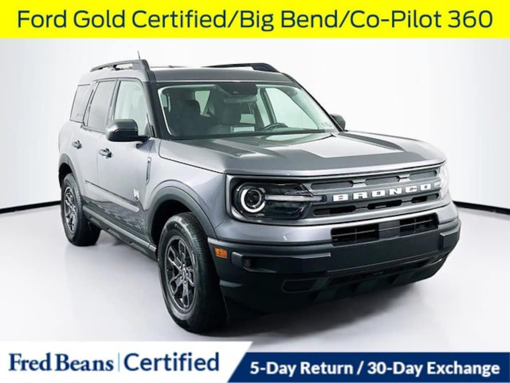 2021 Ford Bronco Sport Big Bend 1.5L EcoBoost 8-Speed Automatic 4WD 4D Sport Utility Carbonized Gray Metallic Ford Gold Certified, 7 Year / 100k Powertrain Warranty, 12 Month / 12,000 Mile Comprehensive Warranty, Local Trade, Air Conditioning, AM/FM radio: SiriusXM, Automatic temperature control, Big Bend Package (96B), Equipment Group 200A, Evasive Steering Assist, Exterior Parking Camera Rear, Ford Co-Pilot360 Assist+, Front Bucket Seats, Front fog lights, Heated door mirrors, Heated Front Bucket Seats, Intelligent Adaptive Cruise Control w/Stop & Go, Leather-Wrapped Steering Wheel, Power door mirrors, Power windows, Rear window defroster, Rear window wiper, Remote keyless entry, Reverse Sensing System, SYNC 3 Communications & Entertainment System, SYNC 3/Apple CarPlay/Android Auto, Tilt steering wheel, Voice-Activated Touchscreen Navigation System, Wheels: 17" Carbonized Gray-Painted Aluminum, Wireless Charging Pad. 25/28 City/Highway MPG